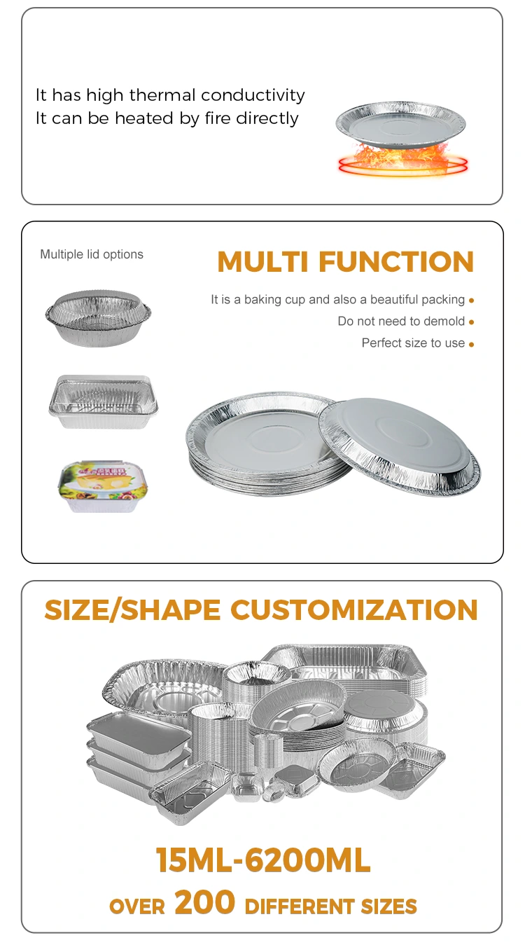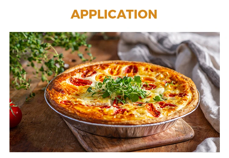 Yunchu aluminijasta folija ponuja 10 -palčne posode za aluminijasto folijo s pico Pizza Piz z številko 13110. Izdelek ima zgornji premer 258 mm (približno 10,1 palca), spodnji premer 203 mm (približno 7,9 palca) in višino 20 mm (približno 0,7 palca). Z zmogljivostjo približno 695 ml (približno 24,5 unče) je primeren za peko pice, ne da bi se prilepila, enostavna za sprostitev iz kalupa in nima vonja. Poleg tega njegova dvignjena ročna zasnova preprečuje, da bi se sestavine prelile in povečajo praktičnost. Prav tako lahko zagotovimo storitve prilagajanja logotipov, ki vam bodo pomagale poglobiti vtis svojih strank in izboljšati prepoznavnost blagovne znamke.