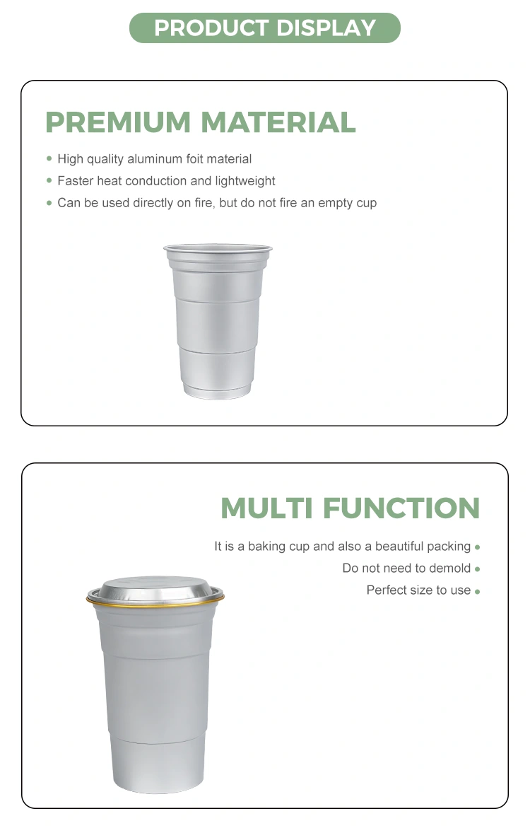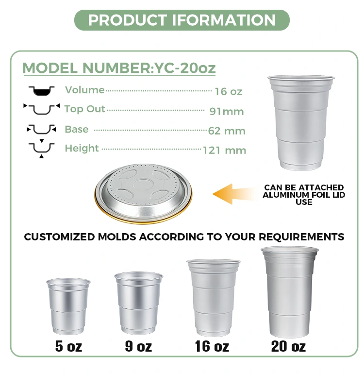 Za razliko od običajnih posod je skodelica za pijačo iz aluminijaste folije za enkratno uporabo Yunchu 16oz za enkratno uporabo posebej zasnovana za zagotavljanje rešitev pakiranja za blagovne znamke v posebnih scenarijih. S svojo kompaktno velikostjo (460 mililitrov) ta prilagodljiva skodelica za pijačo iz aluminijaste folije za enkratno uporabo s prostornino 16 oz po meri ustreza navadam uživanja instant pijač za enkratno uporabo. Ti 16 oz po meri aluminijasti kozarci za enkratno uporabo iz aluminijaste folije za zabavo so poleg praktičnih funkcij še posebej primerni za hrano s seboj, trge ali kampiranje. Predvsem lahko pomaga povečati vrednost blagovne znamke.