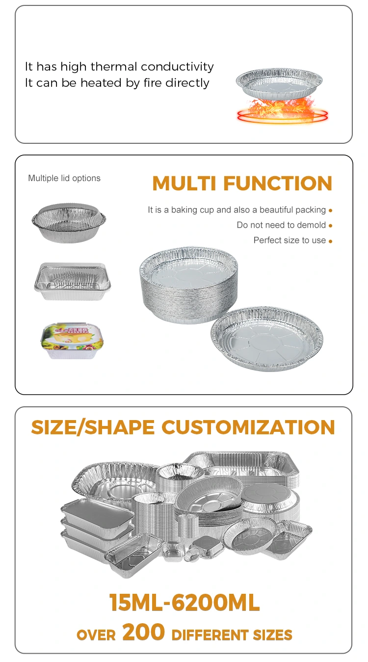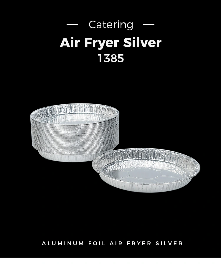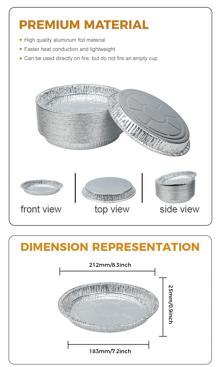Model aluminijaste folije Yunchu 1385 7-9 palcev Pizza Pan Silver Aluminium Foil Renters z zgornjim premerom 212 mm (8,3 in), spodnji premer 183 mm (7,2 in), višina 25 mm (0,9 in). Z zmogljivostjo približno 680 ml (23,9 oz) je primeren za peko pice in druge pekovske izdelke z gladko površino, nelepljenjem, enostavno sproščanjem in brez vonja. Zasnova dvignjenega roba preprečuje, da bi se sestavine razlile in izboljšajo učinkovitost pečenja. Poleg tega lahko vsebnik ponuja storitve prilagajanja logotipa, ki lahko pomagajo poglobiti vtise strank in izboljšati sliko blagovne znamke.