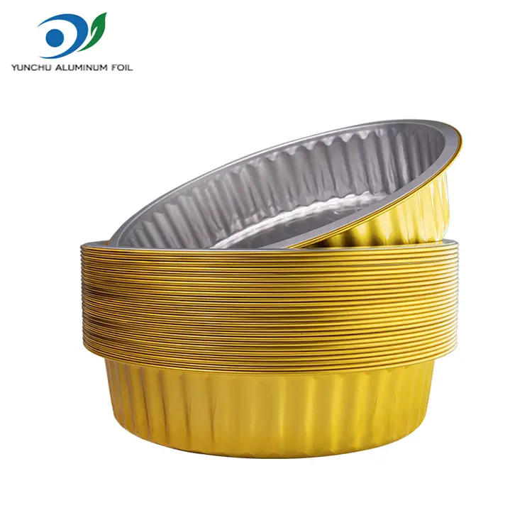 Yunchu aluminum foil supplier Disposable barbecue trays Golden Round Aluminum Foil Containerscan be applied to the scene of takeaway distribution, catering packaging, group meals, cold chain transportation, food refrigeration, etc., this disposable barbecue plate golden round aluminum foil container can be loaded and applied to all kinds of food at the same time, and can be used with alcohol lamps and shelves, support aluminum Folijska škatla in aluminijasta folija kombinacija kombinacije naročilo na debelo, en sam MOQ v višini 1000 kosov, z odlično visoko in nizko temperaturno odpornostjo, primerno za uporabo na različnih krajih.