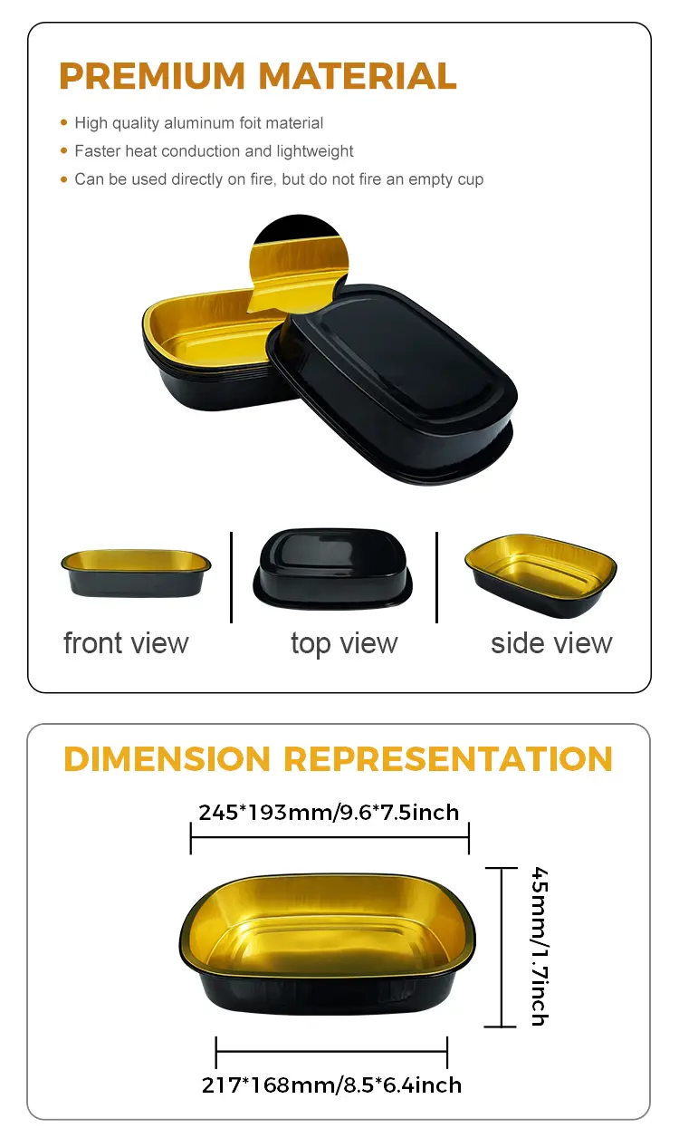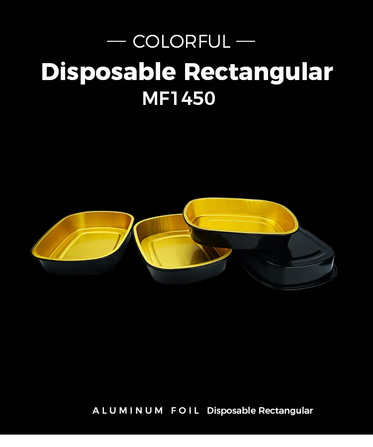 Pravokotni aluminijasti foliji za enkratno zlato za enkratno uporabo za enkratno zlato pladenj MF1450 ima zgornji premer 245*193 mm (9,6*7,5 palca), spodnji premer 217*165 mm (8,5*6,4 palca), višina 45 mm (1,77 palcev).