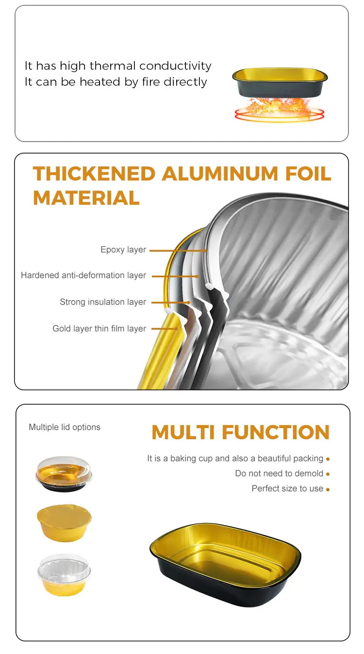 Yunchu Aluminium Foil Dobavitelj za enkratno pecilno pladenj za enkratno aluminijasto folijo za enkratno uporabo za enkratno zlato za enkratno uporabo MF1450 je primeren za obsežne gostinske ponudbe, še posebej primerne za cantine, restavracijske verige in hladilno distribucijo hrane in drugih scenarijev, ta izdelek je narejen iz maminine, ki je narejena v kraju, ki je bil turški, je primerno za nekaj turškega aluminijevega materiala. Močna toplotna prevodnost lahko enakomerno razprši visoko temperaturo, da se hrana enakomerno segreje, z dobro nosilno nosilnostjo in tlačno zmogljivostjo, da se zagotovi, da ga med prevozom ni enostavno iztišati in se deformirati, lahko uporabite s folijskim toplotnim tesnilom ali plastičnim pokrovom.