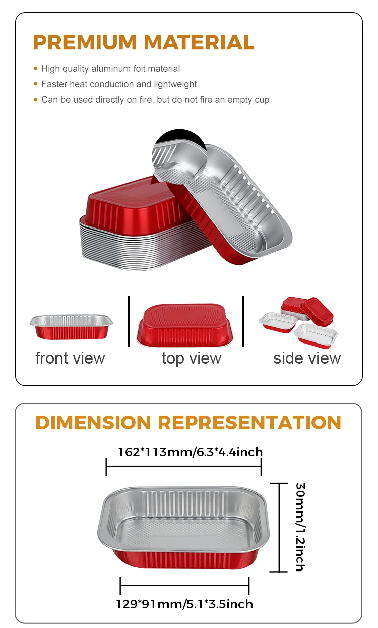 -Material pravokotne rdeče aluminijaste posode za ven lahko zaklene svežino in svežino hrane. Njegova odlična toplotna prevodnost in izolacijske lastnosti omogočajo neposredno segrevanje v pečici, mikrovalovni pečici in hlajenje v hladilniku, kar učinkovito zaklene prvotni okus obroka in dolgo časa ohranja idealen okus.