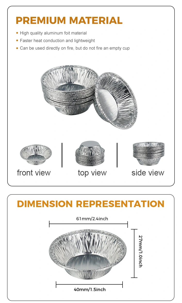 Pladenj za jajčne pite Yunchu iz aluminijaste folije za enkratno uporabo Srebrna posoda iz aluminijaste folije je izdelana iz odebeljene aluminijaste folije za hrano in je prestala več varnostnih testov. Je brez vonja in škodljivih ostankov, zaradi česar je neposreden stik s hrano varnejši. Edinstvena odebeljena oblika daje izdelku odlično oporo in odlično odpornost na visoke temperature. Ne glede na to, ali je pečen pri visokih temperaturah v pečici ali natančno segret v zračnem cvrtniku, se ne deformira zlahka ali pušča, kar zagotavlja, da so jajčne torte popolnoma strjene in so robovi hrustljavi ter se ne sesedejo. Hkrati material iz aluminijaste folije enakomerno prevaja toploto, kar omogoča enakomernejše segrevanje jajčnih torte, izogibanje zažganosti zunaj in surovosti znotraj ter enostavno peko profesionalne jajčne torte, ki so zlate na zunaj in mehke na znotraj.
