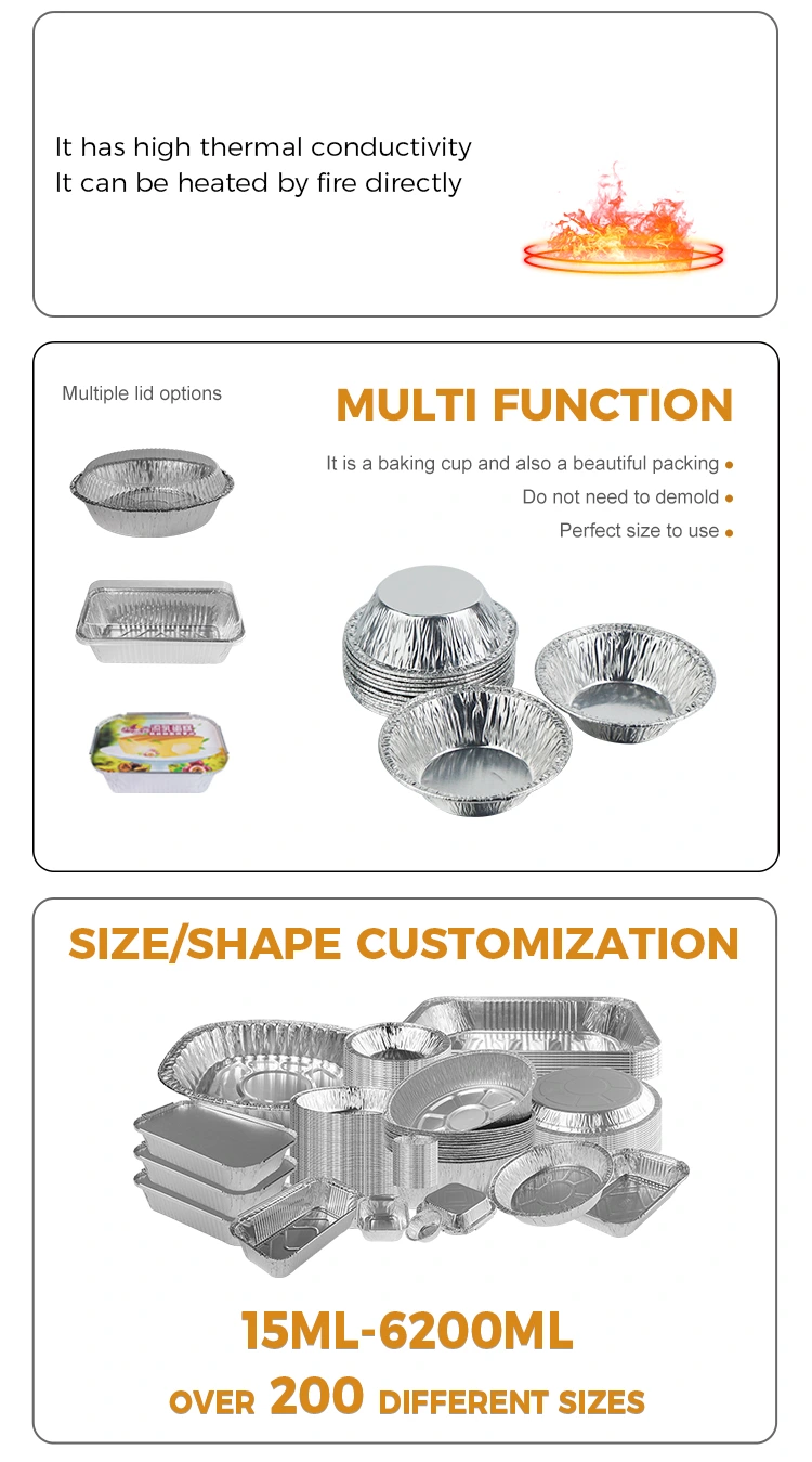 Srebrna posoda iz aluminijaste folije za enkratno uporabo Foshan Yunchu Aluminium Foil Technology Co., Ltd., ki se zanaša na napredne avtomatizirane proizvodne linije in strog nadzor kakovosti, izdelava posode iz srebrne aluminijaste folije za enkratno uporabo Yunchu iz aluminijaste folije za jajčne torte, z materiali za živila in odlično zmogljivostjo, primerna za več gospodinjskih in komercialnih scenarijev, zaradi česar je peka bolj brezskrbna in okusna.