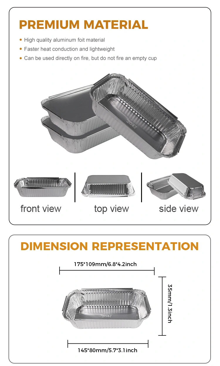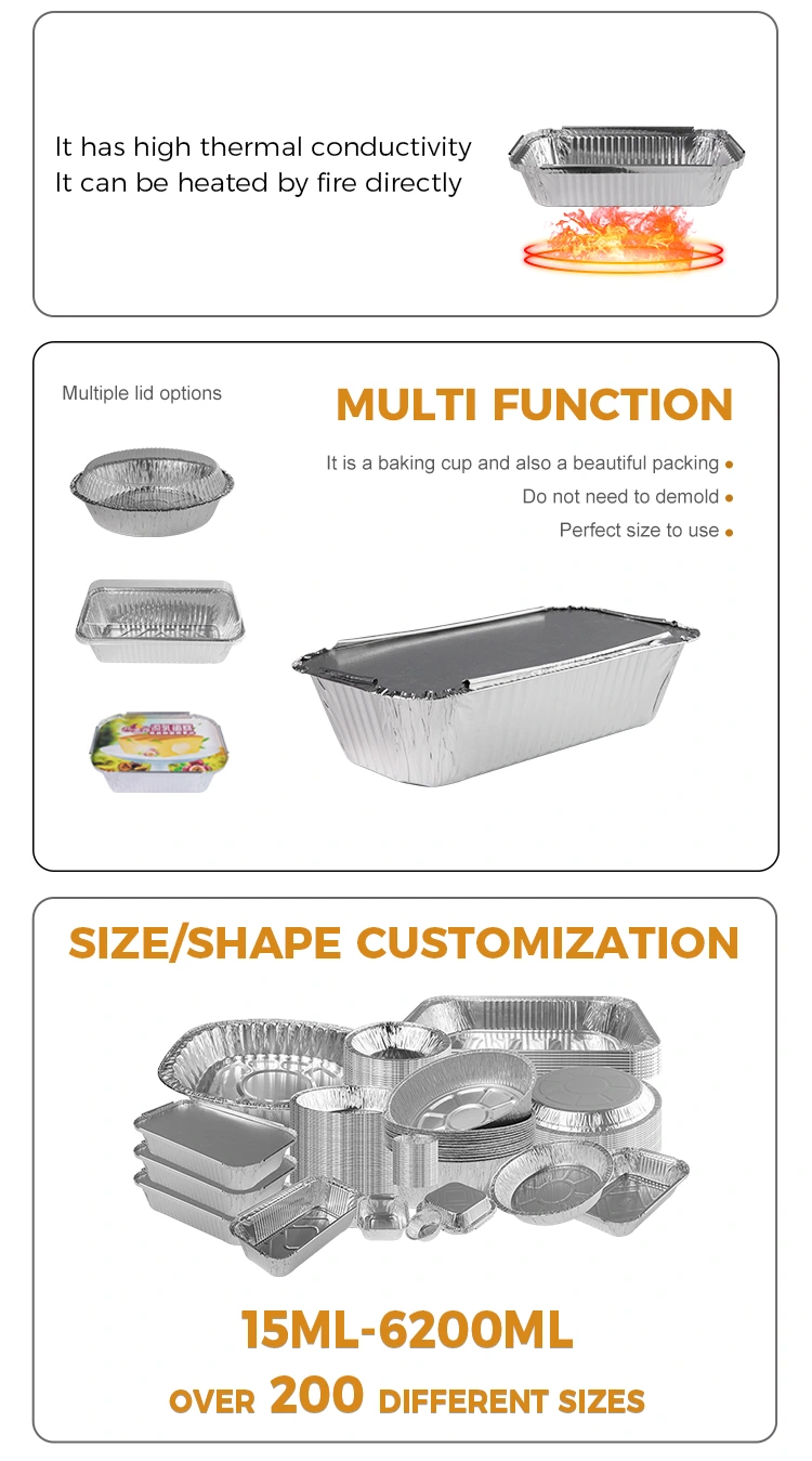 Ta posoda za hitri žar za hitri hrani za enkratno hrano za hitri hrani so izdelani iz kakovostnega 8011 aluminijaste folije, ki ima dober učinek ohranjanja toplote in lahko vzdržuje temperaturo hrane, zaradi česar je hrana bolj okusna in okusna. Poleg tega je naša pravokotna posoda za aluminijasto folijo v BBQ opremljena tudi s toplotno izolacijsko funkcijo, ki jo je mogoče seznaniti z aluminijastim pokrovom folije ali plastičnim pokrovom PET, ki je primeren za prilagojeno logotip in še poveča sliko blagovne znamke.
