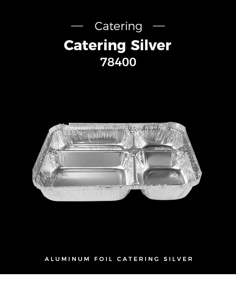 Yunchu Aluminum Foil Supply Factory launched a new Disposable multi-compartment fast food Silver Aluminum Foil Containers, model number 78400. The container is cleverly designed, with an upper diameter of 244 mm (9.6 in) and 195 mm (7.6 in) and a lower diameter of 217 mm (8.5 in) and 168 mm (6.6 in), with an overall height of only 41 mm (1.6 v). Z zmogljivostjo približno 1020 ml (36,0 oz) je priročno in praktično za držanje različnih živil v štirih oddelkih.