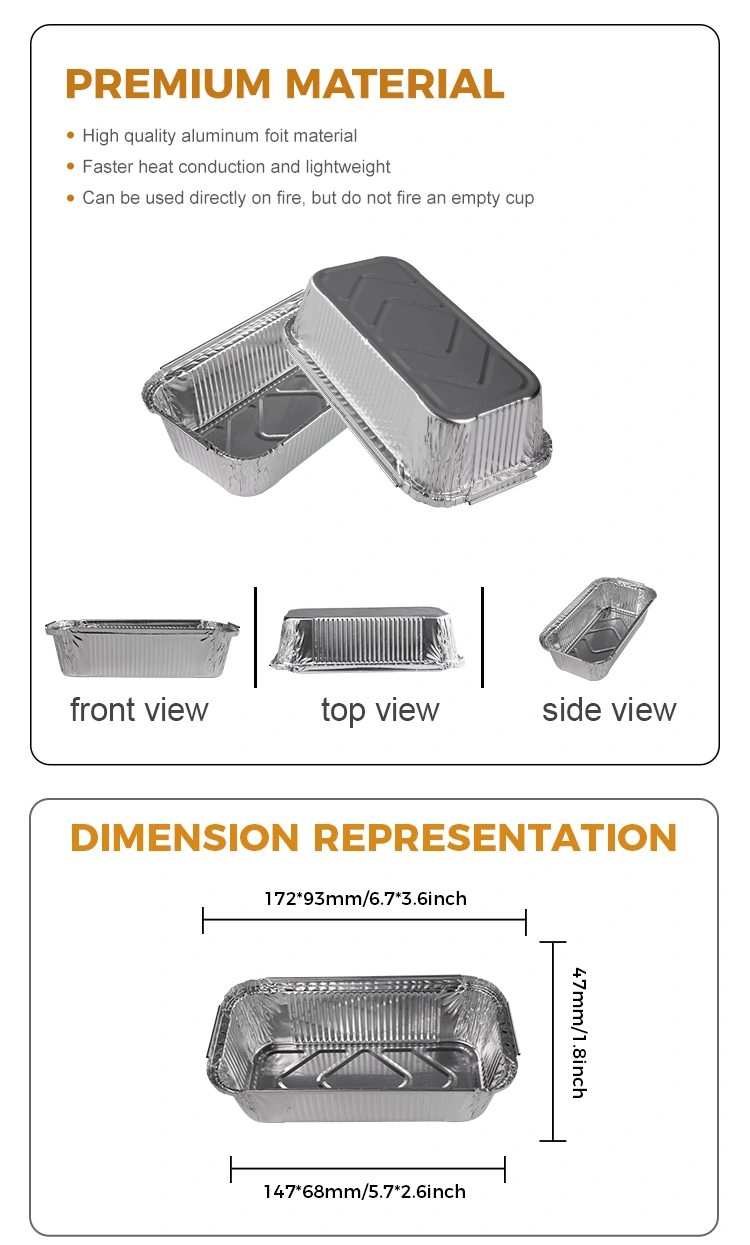 Yunchu aluminum foil supplier's Disposable rectangular baking Silver Aluminum Foil Containers, long-lasting baking resistance, open flame available, upgraded heightened design, prevent dirty pot walls, heightened design, prevent soup from flowing out, food is not easy to stick, easier to take, smooth edges are used without cutting hands, inward folding edges prevent cutting hands, details are treated carefully, direct contact with the Vsebnik, ki se lahko uporablja kot užitni zabojniki, enkratna uporaba je brez skrbi in čiščenja, ob uporabi pa ga ni treba očistiti, priročno in higiensko. Uporabljene dirty aluminijaste folije imajo tudi določeno vrednost recikliranja, kar zadeva nadzor kakovosti, strogo spremljamo vsak korak proizvodnje, da zagotovimo, da vsi izdelki izpolnjujejo nacionalne varnostne standarde. Družba je pridobila varnostno potrdilo o aluminijastih embalažnih materialih za hrano, ki jih je izdala država, in sprejela nemško certifikat ERP, certifikat EU SGS in certifikat ISO9001.