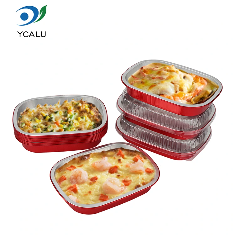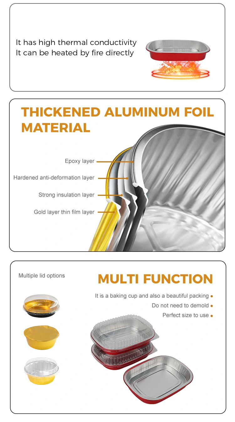 Pekarne in zahodnjaške restavracije lahko uporabljajo kvadratne posode iz rdeče škatle za kosilo za enkratno uporabo iz aluminijaste folije za prodajo durianov na žaru, pečenega sladkega krompirja in mesnih krožnikov na žaru. Zlata tekstura izboljša kakovost izdelka. Stranke jih lahko pogrejejo in pojedo neposredno brez dodatnega oblaganja. Trgovci s hrano za s seboj ga uporabljajo za dostavo pečenega riža, piščančjih peruti na žaru in drugih jedi. Aluminijasta folija zadrži temperaturo in svežino. Tudi eno uro po dostavi hrana ostane topla in juha ne pušča.