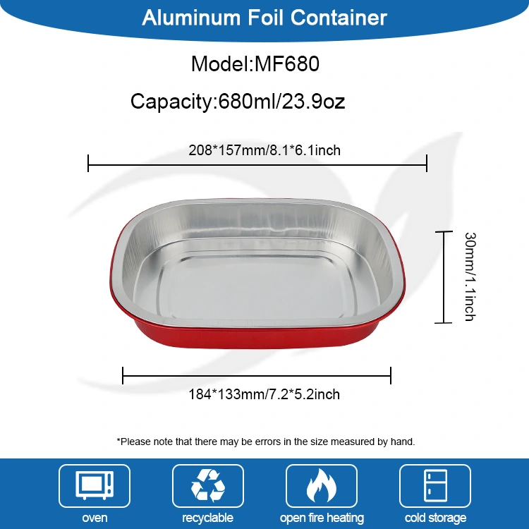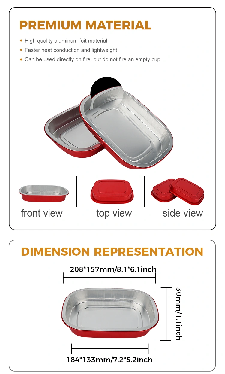 Yunchu je profesionalni proizvajalec in dobavitelj posod iz aluminijaste folije na Kitajskem. Kvadratne posode iz aluminijaste folije za enkratno uporabo, ki vam jih ponujamo, imajo premer 208*157 milimetrov (8,1*6,1 palca). Spodnji premer je 184*133 (7,2*5,2 palca), višina 30 (1,1 palca), prostornina pa približno 680 mililitrov (23,9 OZ). Uporablja osnovni material z odebeljeno aluminijasto folijo za živila 8011, ki upošteva tako žilavost kot nosilnost, ni ga enostavno deformirati ali puščati in lahko neposredno podpira hrano. Združljiv je z ultra širokim temperaturnim območjem od -20 ℃ do 220 ℃. Razkalupljanje ni potrebno. Za uporabo ga lahko daste neposredno v pečico, cvrtnik ali soparnik, lahko pa ga tudi ohladite za konzerviranje. Ponuja priročno izkušnjo "peke - shranjevanja - porabe - odlaganja" na enem mestu. Glavna prednost aluminijaste folije je njena visoka toplotna prevodnost. Zlata prevleka pomaga pri zbiranju toplote, kar zagotavlja enakomerno in hitro segrevanje hrane.