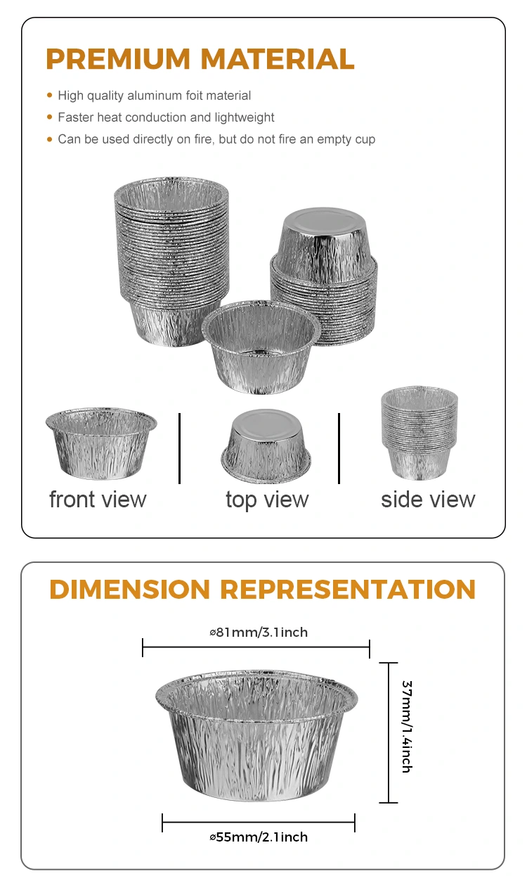 Ta okrogel pladenj za enkratno uporabo iz srebrne posode iz aluminijaste folije ima okrog sebe nagubane oblike, ki olajšajo rokovanje in so primerni za pripravo različnih dobrot, pa naj gre za torte, pudinge ali kuhana jajca. Posoda je izdelana iz visokokakovostnega materiala iz aluminijaste folije z gladko in občutljivo površino in je enostavna za čiščenje. Poleg tega ima ta material tudi dobro odpornost na visoke temperature in lahko prenese temperature nad 200 °C, kar zagotavlja varno kuhanje hrane.