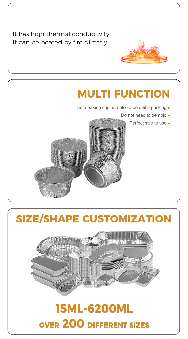 Proizvajalec aluminijaste folije Yunchu je dal na trg posode iz srebrne aluminijaste folije za enkratno uporabo okroglega pladnja za torto, ki ima obliko okrogle posode za peko in ima na dnu utore, zaradi česar je stabilen in deluje proti zdrsu. Te posode ni treba čistiti in jo lahko po uporabi zavržete, kar je priročno in hitro. Hitro prevaja toploto, ni enostavno zažgati in se prilepiti na dno, opremljen pa je z robnim dizajnom. Narejen je iz odebeljenega materiala, ki je trden in vzdržljiv, ni ga lahko poškodovati, je odporen na olje in madeže ter ga je mogoče zlahka odstraniti iz kalupa.