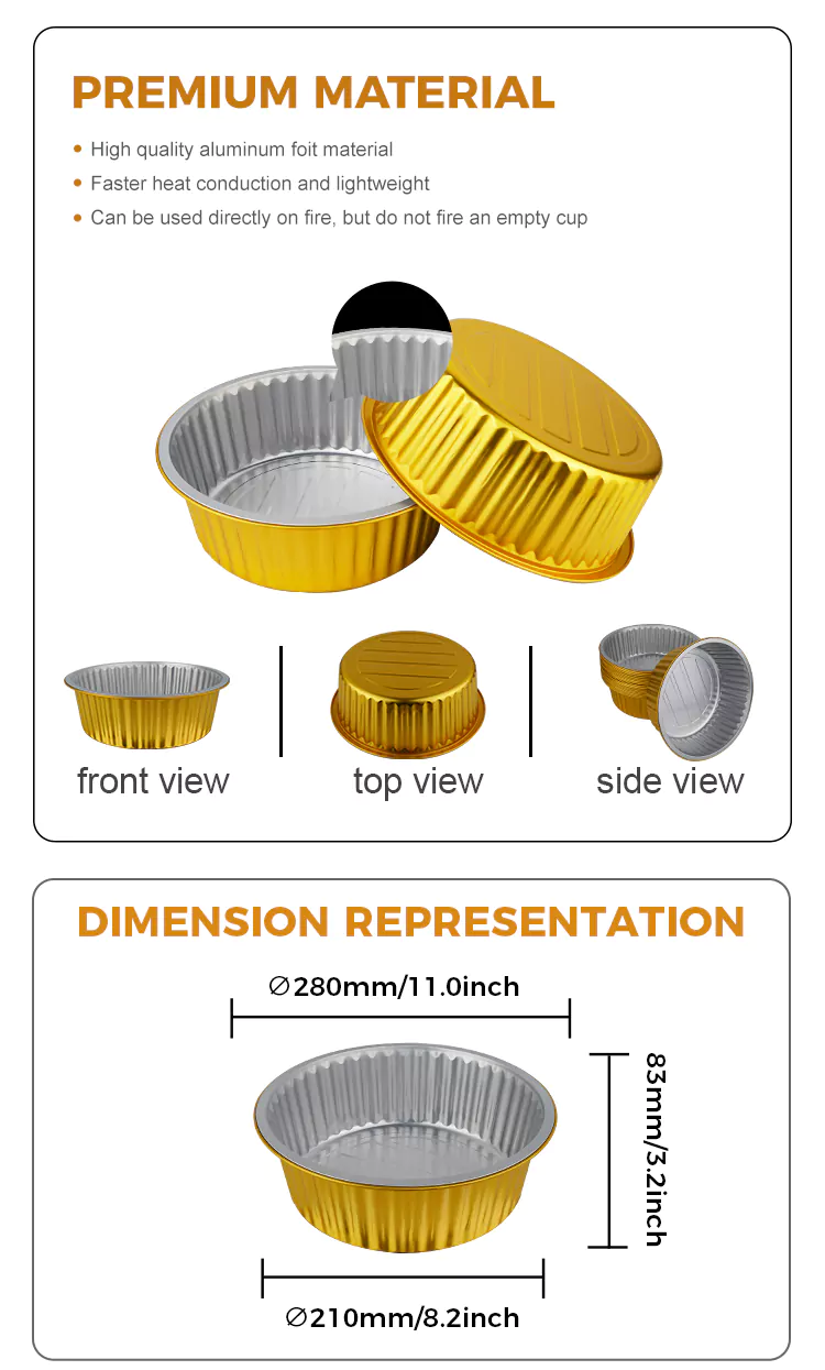 Odlična zmogljivost toplotne prevodnosti je ena od glavnih prednosti okroglih posod iz aluminijaste folije za enkratno uporabo velike prostornine. Aluminijasta folija hitro in enakomerno prevaja toploto. Ne glede na to, ali ga pečemo v pečici, segrevamo na odprtem ognju ali v mikrovalovni pečici, lahko poskrbi za enakomerno segrevanje hrane, skrajša čas kuhanja in ohrani prvoten okus sestavin. Krožna oblika je bolj ugodna za kroženje toplote. Skupaj s pokrovom iz aluminijaste folije, ki ga je mogoče zatesniti, ne more le preprečiti izgube vlage, ampak tudi doseči integrirano ohranjanje in ogrevanje. Med dostavo lahko hrano učinkovito ohranja toplo, kar potrošnikom omogoča, da kadar koli uživajo v topli hrani.