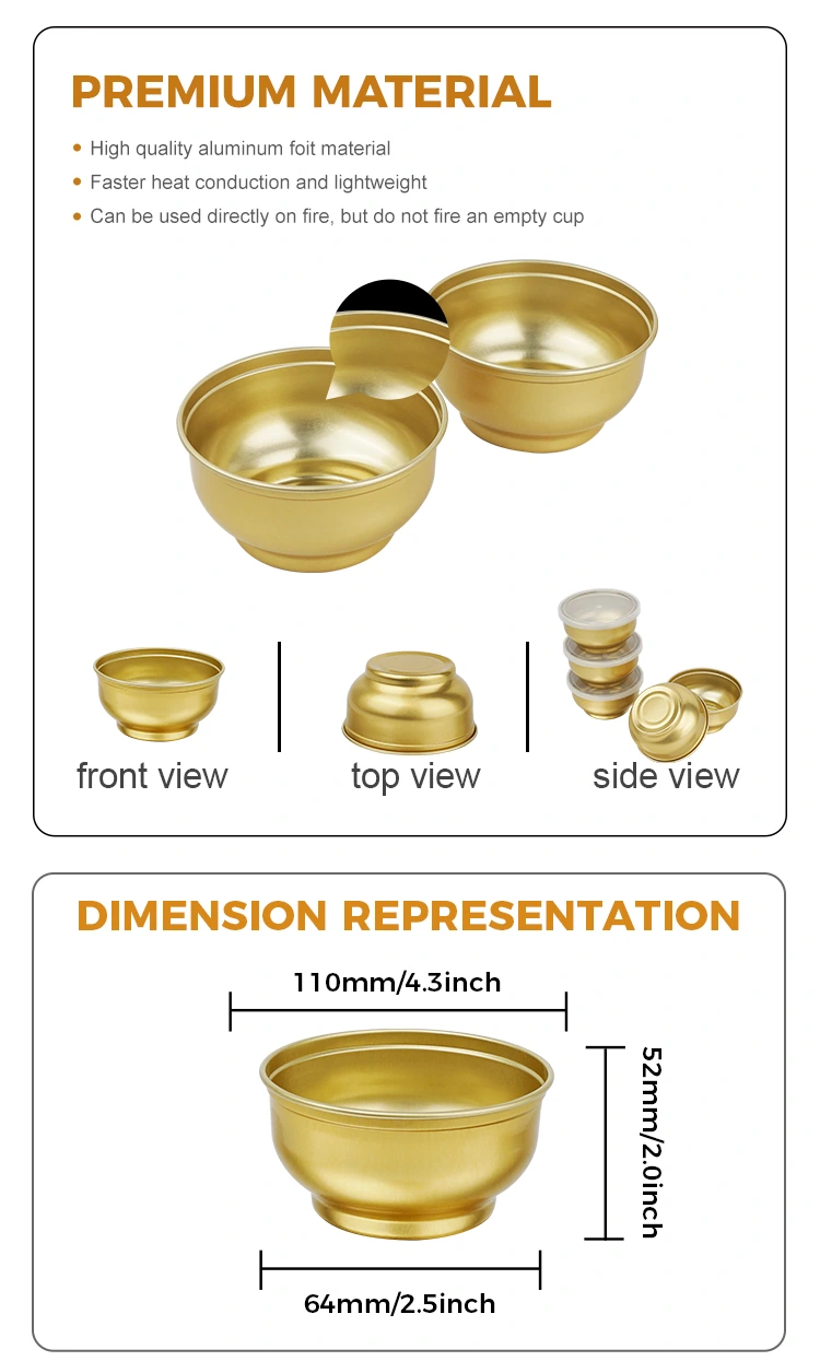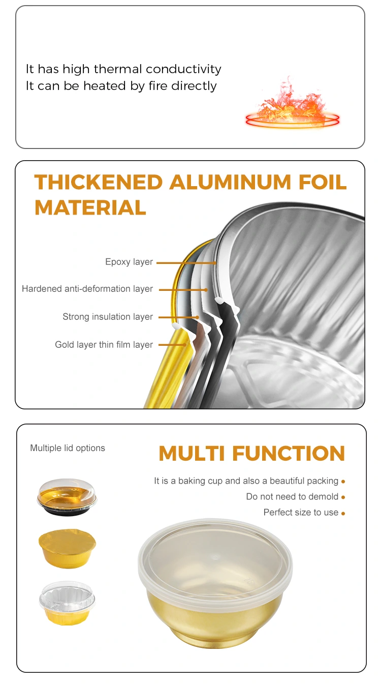 Yunchu Aluminum Foil Manufacturing Factory, Disposable round small gold bowl Aluminum Foil Containers, a uniquely shaped bowl-type aluminum foil container, this container is geared towards packaging, pre-cooked meals, rice, noodles, etc. It is more convenient than takeout, more economical than dining out, and tastier than meal replacement shakes/cookies. Posamezno pakirane sklede niso nagnjene k poškodbam kože, enostavne za nošenje, narejene iz izbranih trdnih in trpežnih materialov, posamično zavite, vakuumsko sterilizirano, enostavno odpreti in jesti, ki se lahko med kuhanjem pri 121 ° C zaklenejo v svežino. Prvotne sklede ni mogoče segreti v mikrovalovni pečici. Na voljo v različnih specifikacijah, ki jih je mogoče zložiti za shranjevanje, lahko aluminijaste sklede zložite, da kuhinja ureja in organizira. Različne velikosti ustrezajo različnim potrebam po embalaži - ena posoda naenkrat je ravno pravšnja.