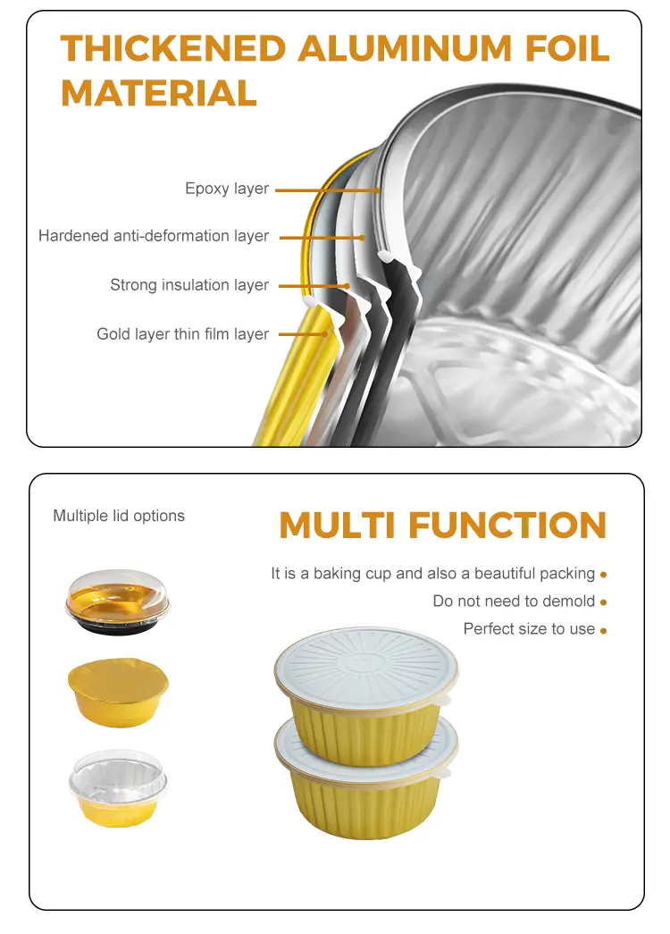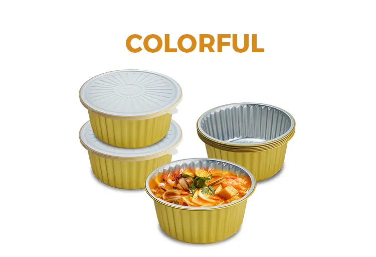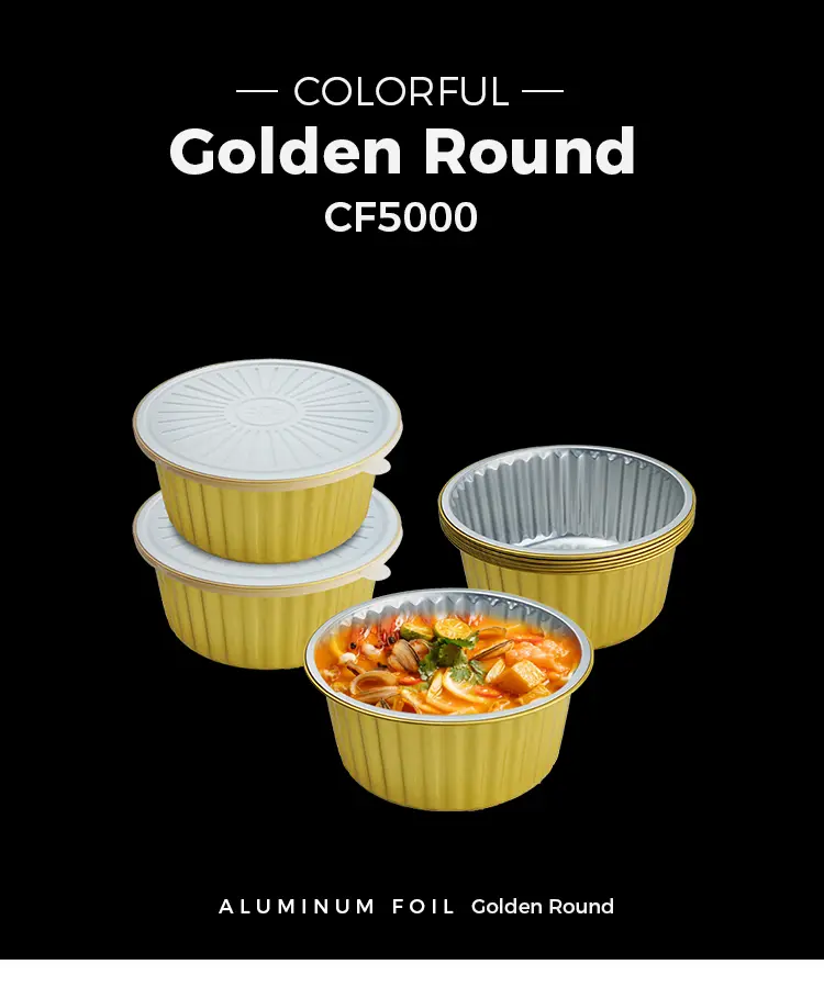 Yunchu Aluminum Foil Disposable Sealable Golden Round Aluminum Foil Containers Model CF5000 Supply Wholesale has a wide range of uses, can use the covered aluminum foil heat sealing lid for baking, storage, transportation, and supply of all kinds of assembly line food, etc., from pre-made dishes and cleaning all kinds of food to supplier food, this container is suitable for a variety of occasions, such as large Trgovine za supermarkete, počitniške zabave, gostinske dejavnosti, samopostrežne gostinske trgovine itd., Za enkratno uporabo zlato okrogle aluminijaste folije za enkratno uporabo, narejene iz kakovostne 8011-0 aluminijeve folije, pladenj za enkratno uporabo s pokrovom, je trajno, ni enostavno prebiti ali poškodovati; Material omogoča enakomerno porazdelitev toplote, dobro zadrževanje toplote, brez lepljivosti, brez goriva, vodoodporen in olje, ni treba čistiti, brez obremenitve oljnih madežev. Gladki robovi ne poškodujejo rok, kar zagotavlja, da so vnaprej pripravljene jedi popolnoma kuhane; Ponev za folije je končana v elegantni zlati barvi, ki izboljša predstavitev in dopolnjuje vašo kuhinjsko ali dogodek.
