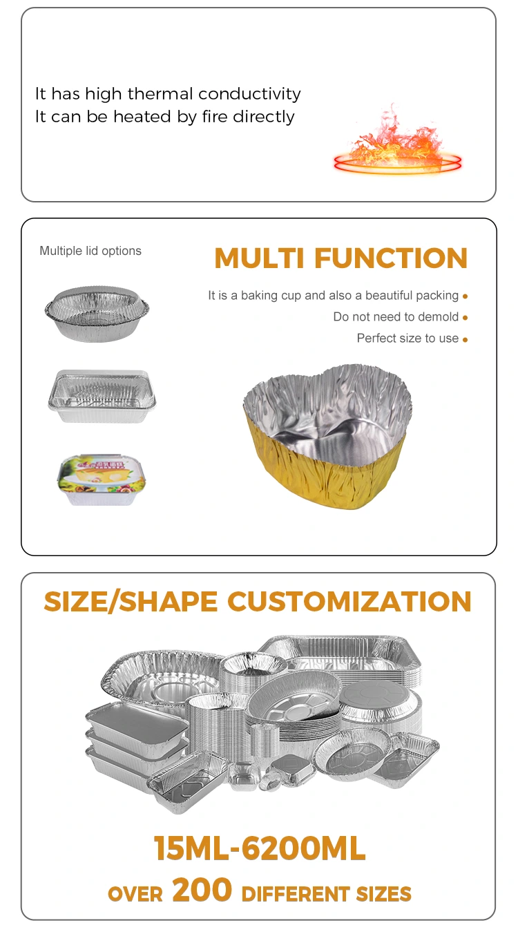 ​Yunchu aluminum foil supplier Heart-shaped mini-bake Silver Aluminum Foil Food Container is very suitable for small packaging, baking applications, unique design, heart-shaped design, can meet a variety of uses, one thing for multiple purposes, the use can place a variety of small food, in addition, the Heart-shaped mini-bake Silver Aluminum Foil Food Container surface is pleated design, which can prevent small snacks and chocolates and other Živila iz zdrsa in lahko izboljšajo odpornost na drsnik, lahko prilagodite različne barve.