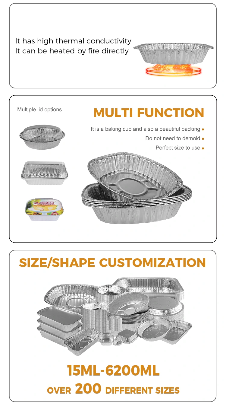 Ta izdelek je izdelek za enkratno uporabo in ga ni treba očistiti, kar prihrani stroške dela. Lahko ga združimo s popolnoma prozornim pokrovom aluminijaste folije, ki učinkovito preprečuje uhajanje prahu in tekočine. Trajnost in varnost izdelka se izboljšata z zasnovo ojačevalcev ter običajne konkavne in izbočene oblike dna. Prenosna zasnova omogoča enostavno prenašanje in ogrevanje, odporno na visoke in nizke temperature, ki jih je mogoče uporabiti v temperaturnem območju od -20 ° C do 250 ° C in je neprepustna za olje in vodo, kar povečuje zadrževanje toplote in prevoza tesnosti izdelka.