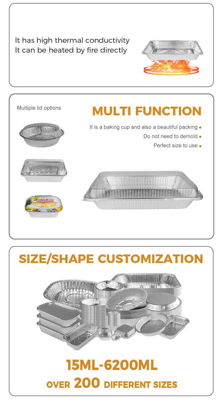 Značilnosti: Ta velika zmogljivost zunanja posoda za peko s srebrom je narejena iz aluminijaste folije s hrano 8011-0, ki v celoti izpolnjuje kontaktni standard, ki zagotavlja varnost hrane brez posebnega vonja in bolj zagotovljeno za uporabo. Ima konkavno in konveksno notranjo zasnovo, ki je bolj varna za uporabo. Oprema je brez čiščenja in ščiti dobro oblogo opreme. Ne glede na to, ali se pečete ali segrejete nad odprtim plamenom, ni treba skrbeti za deformacijo zabojnikov ali vplivanje na varnost hrane.
