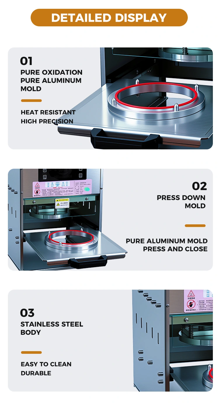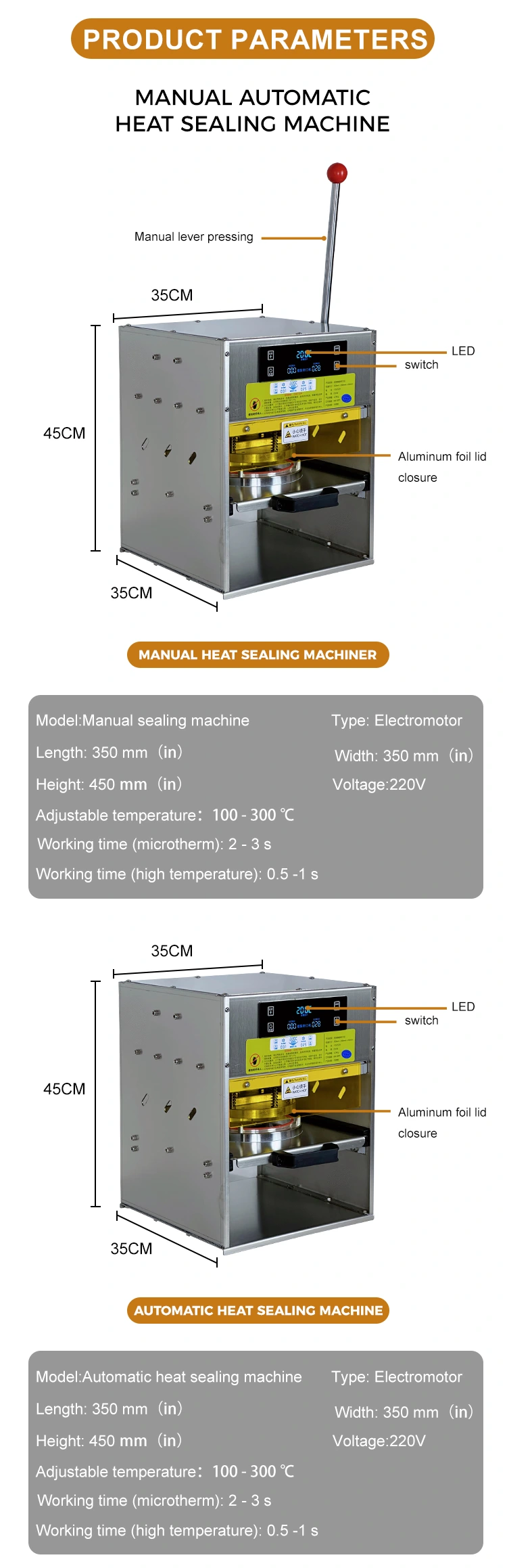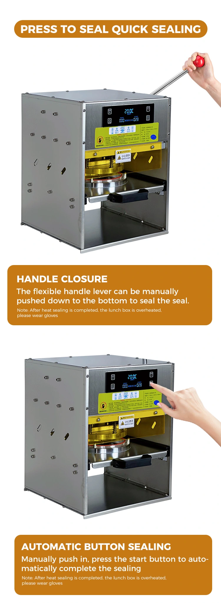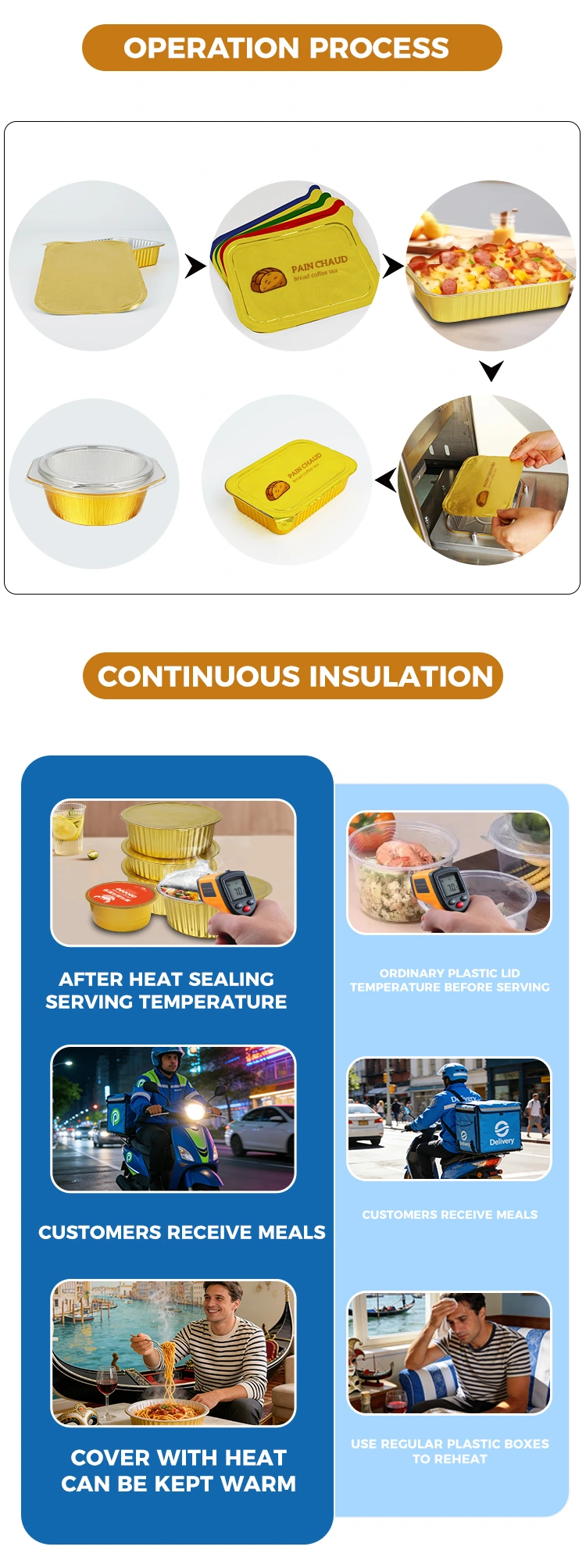 Močna prilagodljivost in preprosto upravljanje: Popolnoma združljiv s to zlato škatlo za kosilo in združljiv tudi z različnimi PP/PE kompozitnimi folijami. Strokovno usposabljanje ni potrebno in lahko začnete v samo 10 sekundah. Samo zaprite in poravnajte škatlo za kosilo ter nežno pritisnite toplotno varilno sredstvo za 3 do 5 sekund, da zaključite tesnjenje, kar znatno izboljša učinkovitost pakiranja.