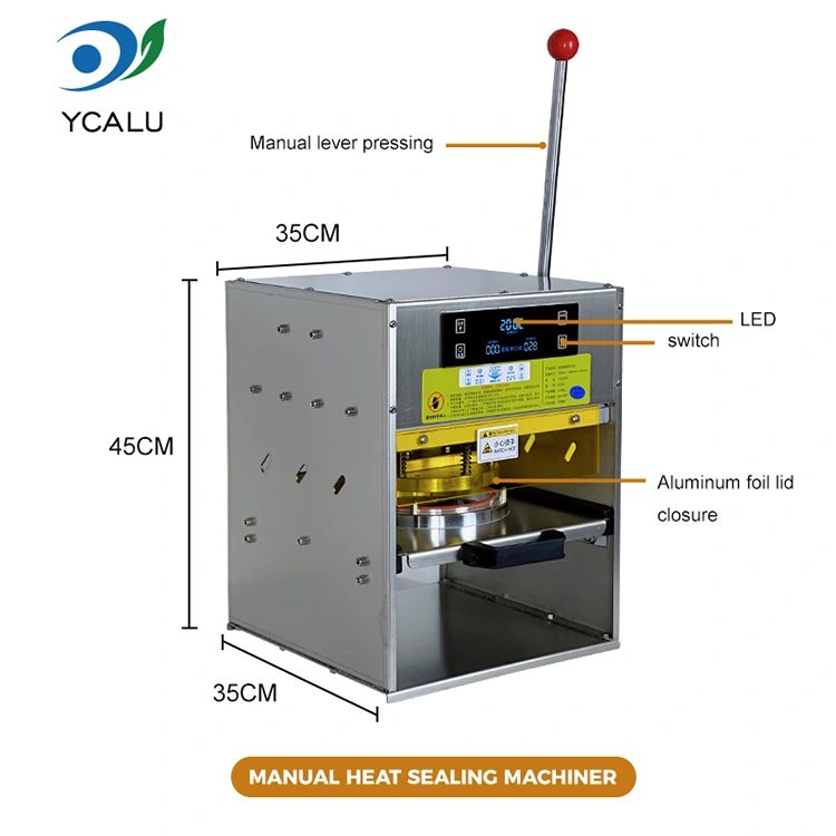 Ročni stroj za toplotno zapiranje dobavitelja Yunchu z zlatimi posodami iz aluminijaste folije lahko natančno zapre in podaljša rok uporabnosti: Opremljen je z natančno komponento za nadzor temperature. Zatesnjen rob je raven in trden, kar lahko učinkovito prepreči vstop zraka, vlage in bakterij, kar podaljša obdobje svežine hrane za 3- do 5-krat. Rešuje glavne boleče točke kuhane hrane, ki je nagnjena k mešanju okusov, sveže hrane, ki je nagnjena k kvarjenju, in omak, ki so nagnjene k puščanju, ter ohranja prvotni okus hrane.