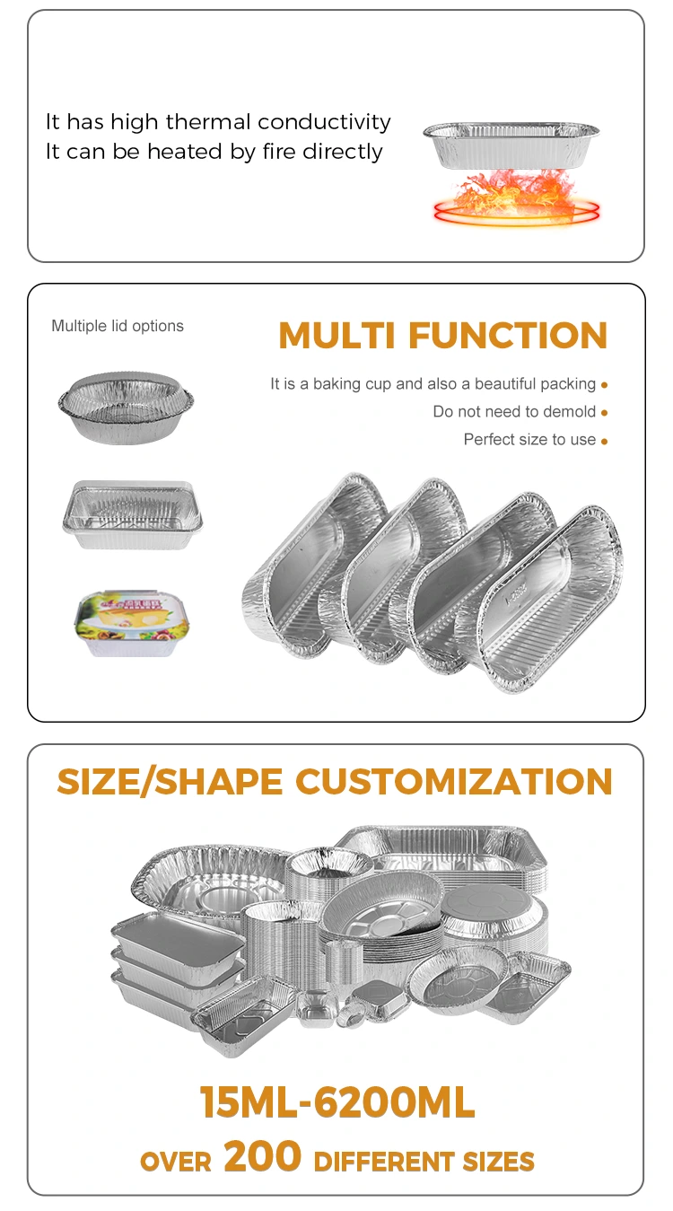 Yunchu Aluminium Foil Dobavitelj ovalni zrak Frepy Silver Aluminium Foil Conteters je vrsta posode, ki jo lahko uporabimo za parjenje, vrelišče, peko, peko in druge namene in se lahko uporablja za omake, potapljanje, majhne začimbe in vzorce vzorcev peke. 8011-0 type aluminum foil material, tensile resistance and corrosion resistance have good elongation, thickened aluminum foil material, durable and not easy to break at will, hemming, front and rear semicircle design does not hurt hands, integrated molding, wall surface is as smooth as a mirror, rich size suitable for use in a variety of scenarios.