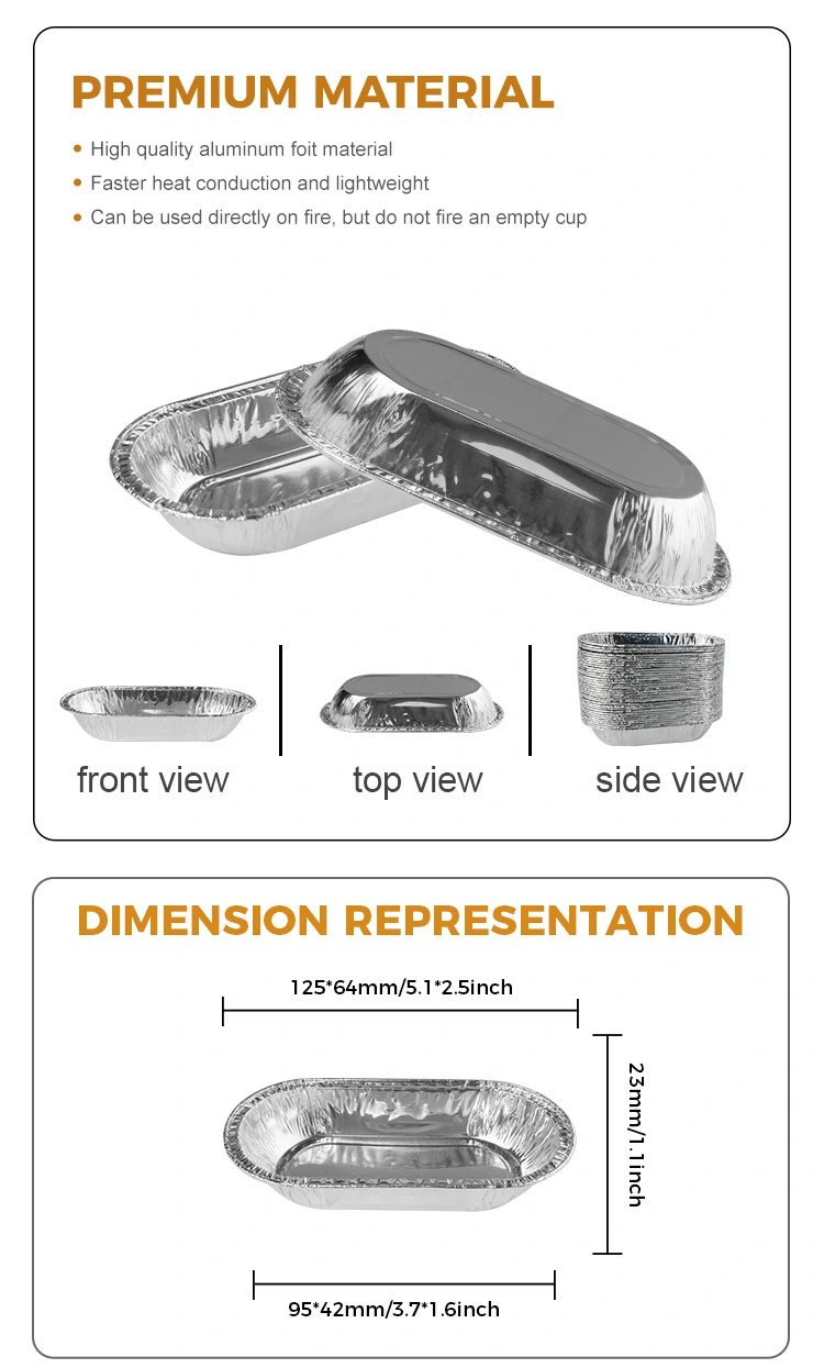 Yunchu aluminijasta folija ovalna pečenka srebrna aluminijasta folija posoda za hrano je majhna posoda za aluminijasto folijo, zasnovana za dolge kruh, pečene piškote, gostinske gostinske, ostrige, omake in drugo hrano. Ne le, da je primeren za embalažne omake, kapljice, majhne začimbe in vzorce za peko, ampak je še posebej primeren tudi za prikaz in oddajanje omak. Zabojnik je izdelan iz materiala iz aluminijaste folije, oblikovan v enem kosu, z zrcalno podobno gladko steno, ki je tako lepa in praktična, kar lahko znatno izboljša celotno teksturo embalaže, še posebej primerno za tiste scenarije živilskih storitev, ki so pozorni do podrobnosti in kakovosti storitev.