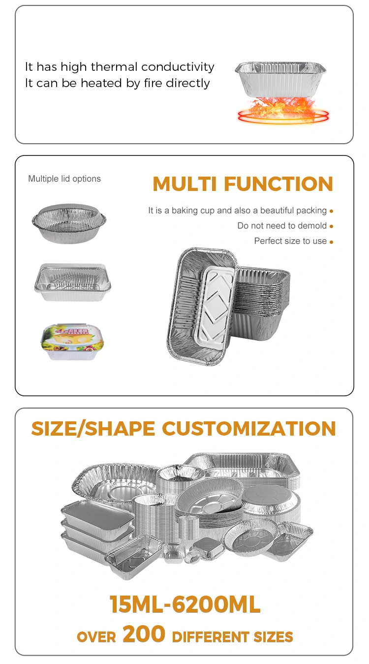 Pravokotni aluminijasti frier iz aluminijaste folije Yunchu Aluminium Foil Silver Aluminium Foil so primerni za različne priložnosti, kot so zračni freče, peka, gostinska zasedba, zabave in prizorišča za samopostrežne storitve. Uporablja se lahko za izdelavo živilskih izdelkov, kot so kvadratni kruh, pečeni piškoti, žari in cvrtniki zraka, in jih je mogoče uporabiti z različnimi prehrambenimi izdelki. Ta posoda je s kapaciteto 450 ml sposobna držati večino živil in ima popolnoma prozoren pokrov za hišne ljubljenčke, da učinkovito prepreči vstop prahu in drugih onesnaževalcev. Gladke zunanje stene olajšajo zlaganje in shranjevanje, prihranijo prostor. Je varna in zdrava za uporabo, in je zelo okolju prijazen, material pa je mogoče reciklirati, kar omogoča enostavno prevoz in ponovno uporabo.