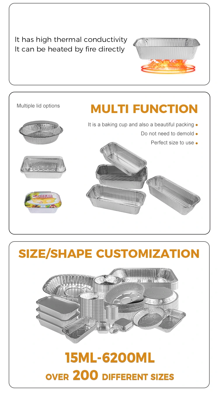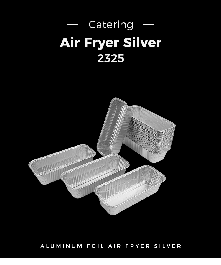 Yunchu Aluminium Foil Model 2325 Pravokotni zračni cvrtniki odvzema srebrne aluminijaste folije, kakovostni material aluminijaste folije se zgosti in ni enostavno razbiti in ga je mogoče ogreti nad odprtim plamenom, ta aluminijasta posoda za folijo ni le lepa po videzu, ampak tudi zelo praktična. Lahko prenese pečenje visokotemperature, dno ni enostavno kuriti ali deformirati, zasnova dna pa je tudi lepa in elegantna, kar lahko učinkovito prepreči, da bi se hrana zalepila. Poleg tega njegova visoko stranska zasnova naredi kombinacijo aluminijaste folije bolj stabilno in lažje za uporabo. Ne glede na to, katere velikosti izberete, se ta posoda za aluminijaste folije odlično prilagodi različnim velikosti loncev, ki skrbi za vaše raznolike potrebe. Da bi več potrošnikom omogočili uživanje v kakovostnih izdelkih in storitvah, ponujamo različne velikosti, med katerimi lahko izbiramo in lahko prilagodimo tiskanje vzorcev glede na vaše potrebe po zadovoljevanju prilagojenih potreb. Z enim samim MOQ le 1000 kosov je postopek nakupa preprost in hiter, stroškovna zmogljivost pa je izjemno visoka. Če imate kakršna koli vprašanja ali jih morate še naprej razumeti o naših izdelkih, vas prosimo, da nas kontaktirate, z veseljem vam bomo služili.