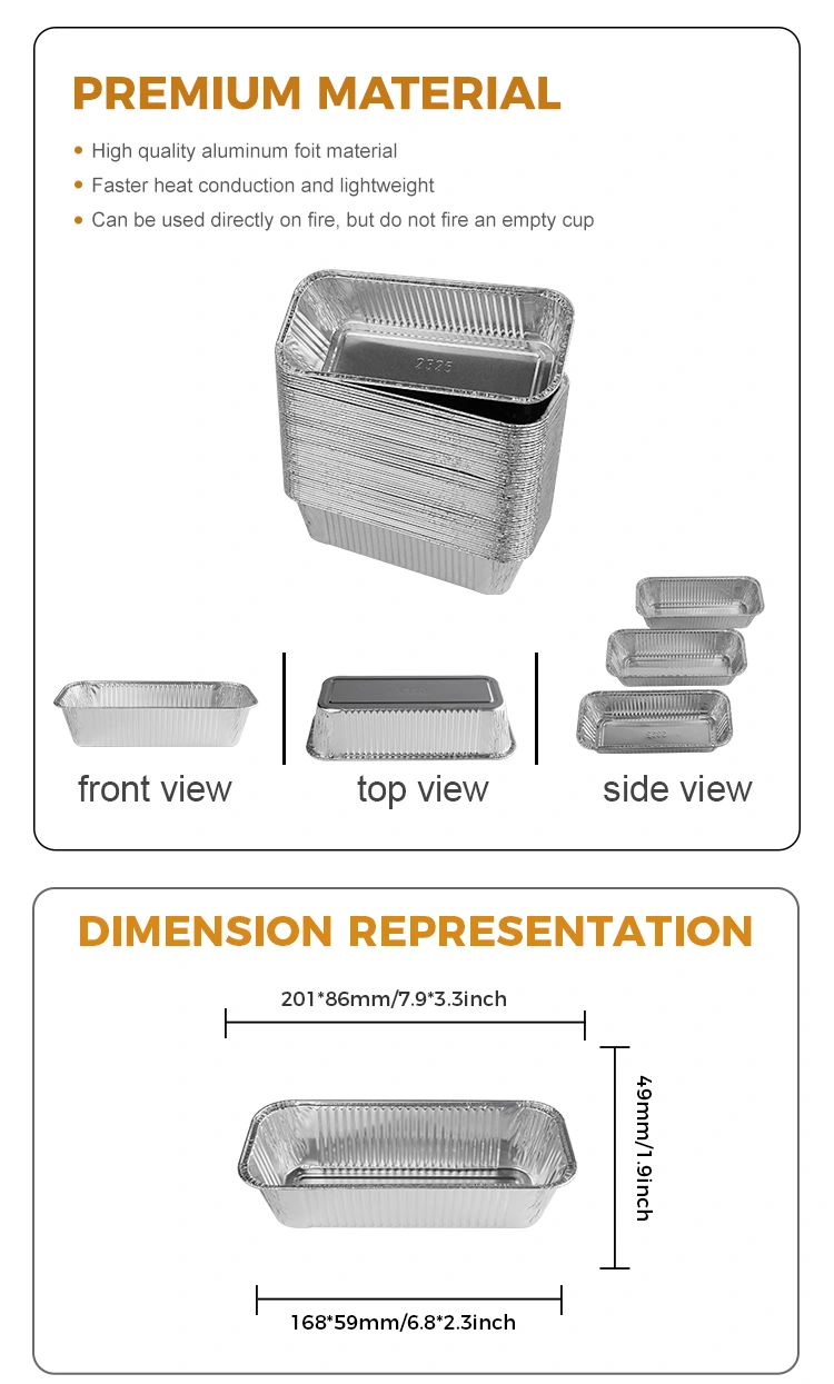 Yunchu Aluminium Foil Model 2325 Pravokotni odvzem zraka Silver Aluminium Foil Conteters kakovostni material aluminijaste folije je zgoščen in ni enostavno razbiti in ga je mogoče ogreti nad odprtim plamenom, ta aluminijasta posoda za folijo ni le lepa po videzu, ampak tudi zelo praktična. Lahko prenese pečenje visokotemperature, dno ni enostavno kuriti ali deformirati, zasnova dna pa je tudi lepa in elegantna, kar lahko učinkovito prepreči, da bi se hrana zalepila. Poleg tega njegova visoko stranska zasnova naredi kombinacijo aluminijaste folije bolj stabilno in lažje za uporabo. Ne glede na to, katere velikosti izberete, se ta posoda za aluminijaste folije odlično prilagodi različnim velikosti loncev, ki skrbi za vaše raznolike potrebe. Da bi več potrošnikom omogočili uživanje v kakovostnih izdelkih in storitvah, ponujamo različne velikosti, med katerimi lahko izbiramo in lahko prilagodimo tiskanje vzorcev glede na vaše potrebe po zadovoljevanju prilagojenih potreb. Z enim samim MOQ le 1000 kosov je postopek nakupa preprost in hiter, stroškovna zmogljivost pa je izjemno visoka. Če imate kakršna koli vprašanja ali jih morate še naprej razumeti o naših izdelkih, vas prosimo, da nas kontaktirate, z veseljem vam bomo služili.