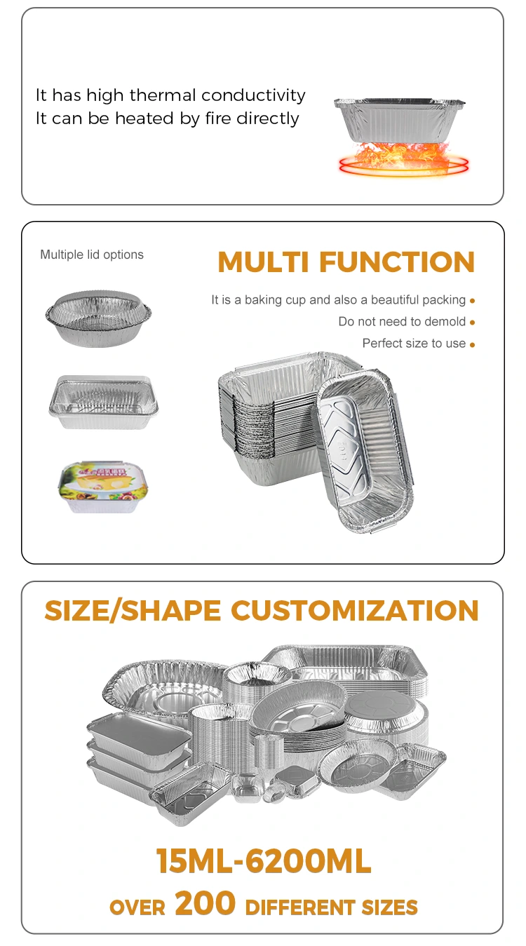 Značilnosti: škatla za kosilo iz aluminijaste folije, ki jo ponujamo, je izdelan iz 8011 aluminijaste folije, ki ima odlične zmogljivosti za ohranjanje toplote in lahko učinkovito vzdržuje temperaturo hrane, zaradi česar je vaša hrana privlačnejša. Zlasti naše pravokotne posode za pečeno riževo srebro aluminijaste folije nimajo samo toplotne izolacijske lastnosti, ampak jih je mogoče kombinirati tudi z aluminijastimi pokrovi folije ali plastičnimi pokrovi za hišne ljubljenčke, da olajšamo prilagojeno prilagoditev logotipov, s čimer izboljšujejo pomnilniške točke kupca in izboljšajo ozaveščenost blagovne znamke.