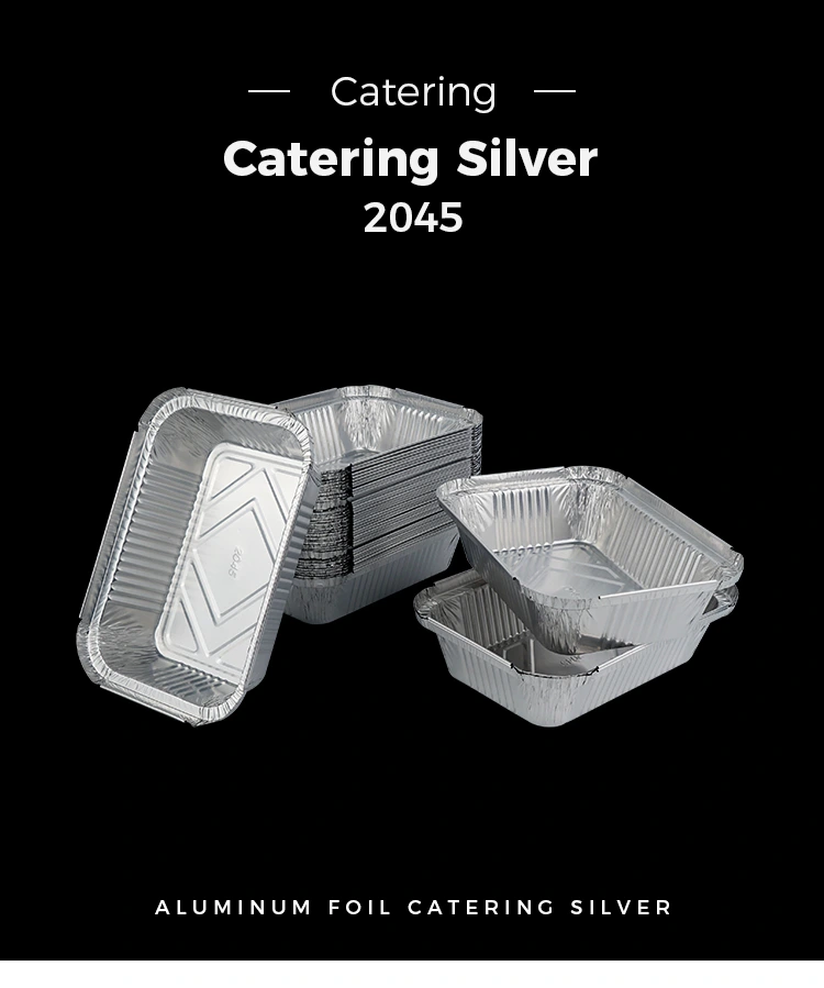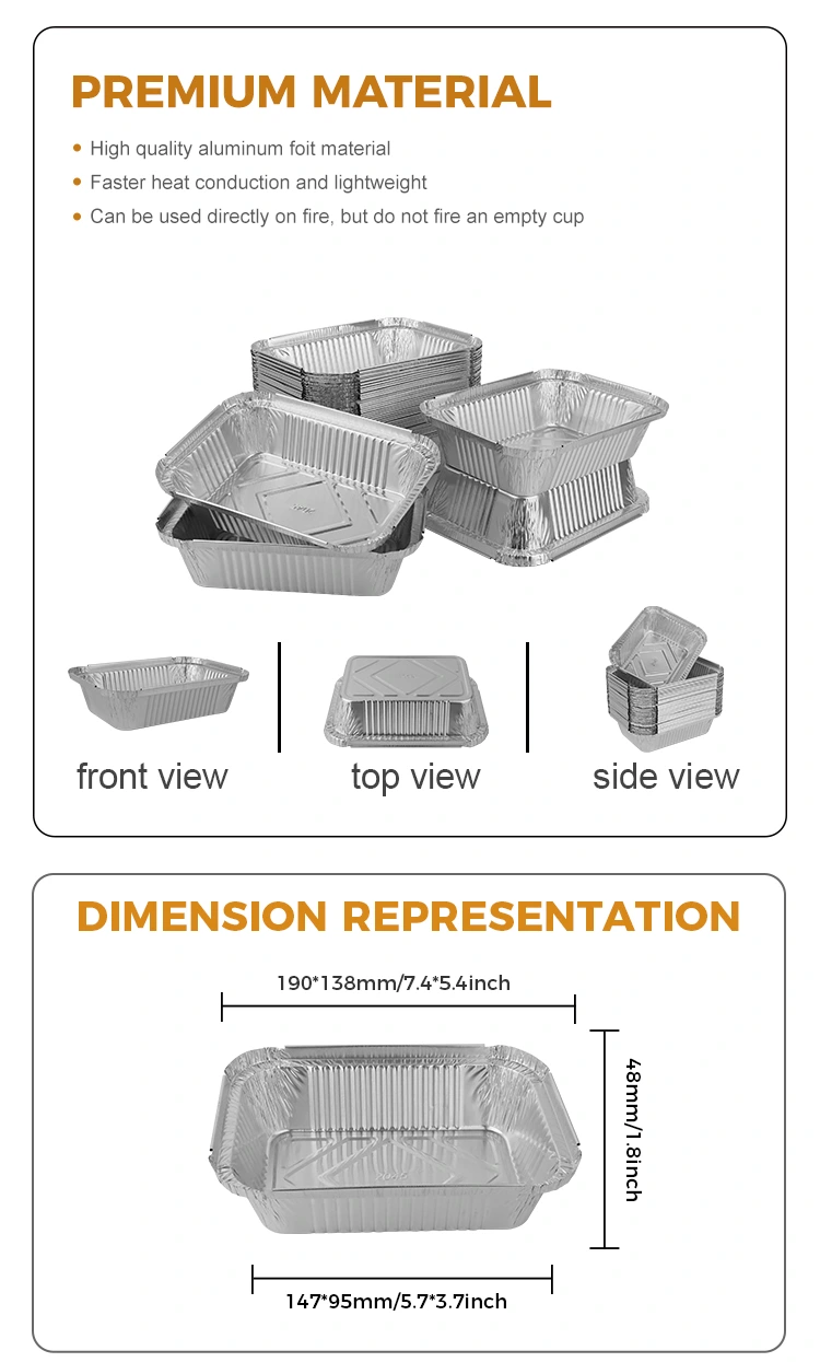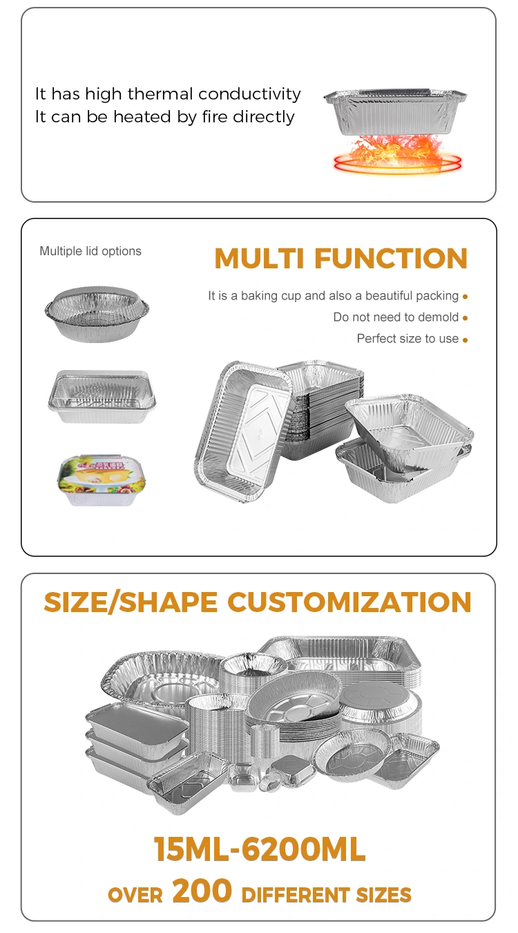 Škatle za kosilo iz aluminijaste folije, ki jih ponujamo, so izdelane iz materiala iz aluminijaste folije 8011, ki ima odlične lastnosti toplotne izolacije in lahko učinkovito vzdržuje temperaturo hrane. Zlasti naša pravokotna srebrna posoda iz aluminijaste folije za peko škatel za kosilo nima samo lastnosti ohranjanja toplote, ampak jo je mogoče uporabiti tudi s pokrovom iz aluminijaste folije, da olajšate prilagojeno prilagajanje LOGOTIPA.