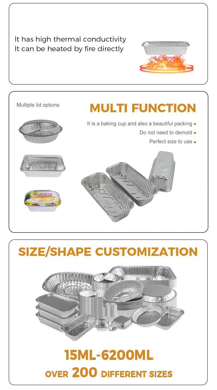 Pravokotni pekač za pladenj za kruh srebrni aluminijasti foliji, ki jih ponuja Yunchu Aluminium Foil dobavitelj, so na voljo v različnih velikostih in specifikacijah, primernih za vse vrste lončke. Ne glede na to, ali gre za velik žar ali majhno domačo pečico, lahko z lahkoto ravna z lahkoto. Na voljo je v različnih velikostih in lahko ustreza potrebam različnih odprtih ognjenih žar, ne glede na to, ali gre za žar na prostem ali začasno uporabo kot jed, ne bo težav.