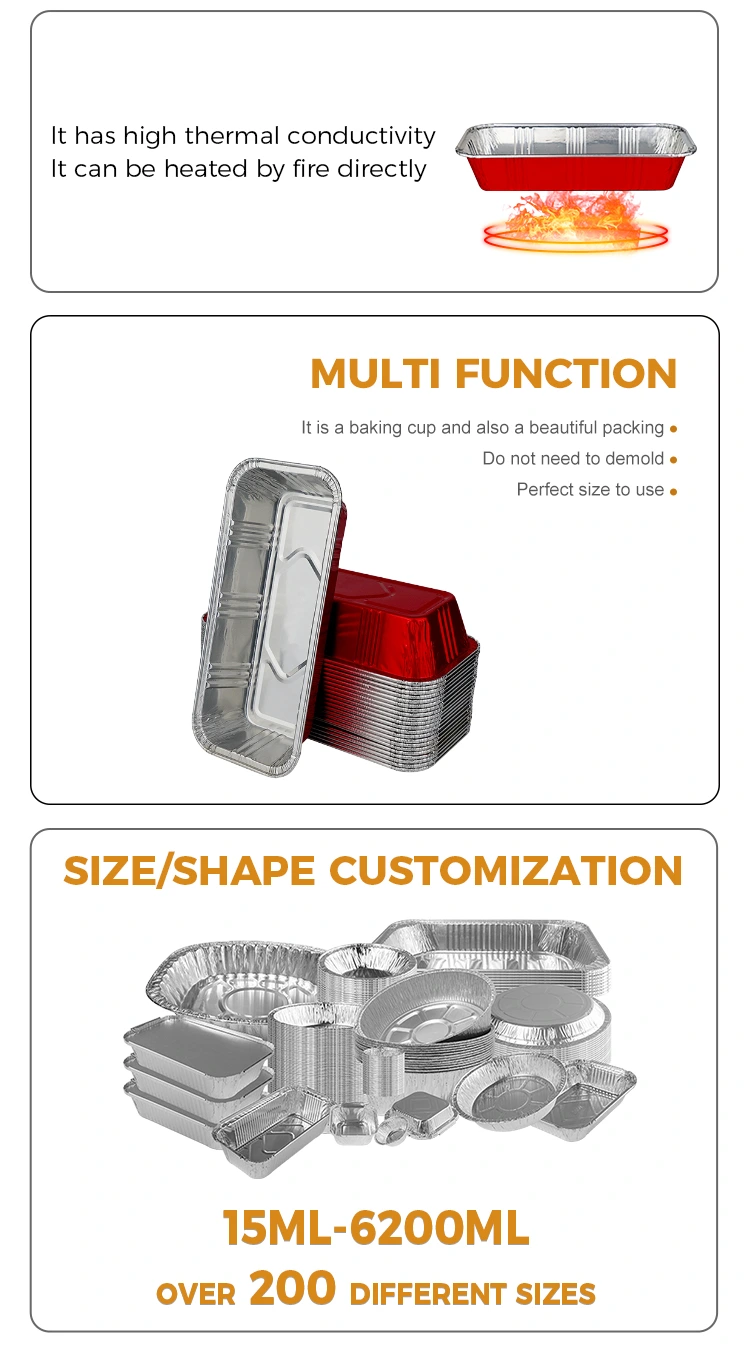 Yunchu aluminijasta folija vam zagotavlja visokokakovostne pravokotne rdeče posode iz srebrne aluminijaste folije za pekarne, ki so zasnovane tako, da so trpežne in odporne na vročino, lahko enakomerno prevajajo toploto, da preprečijo zoglenitev, in imajo močno tesnjenje, da ostanejo sveže.