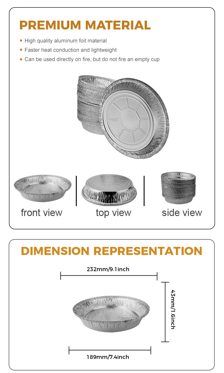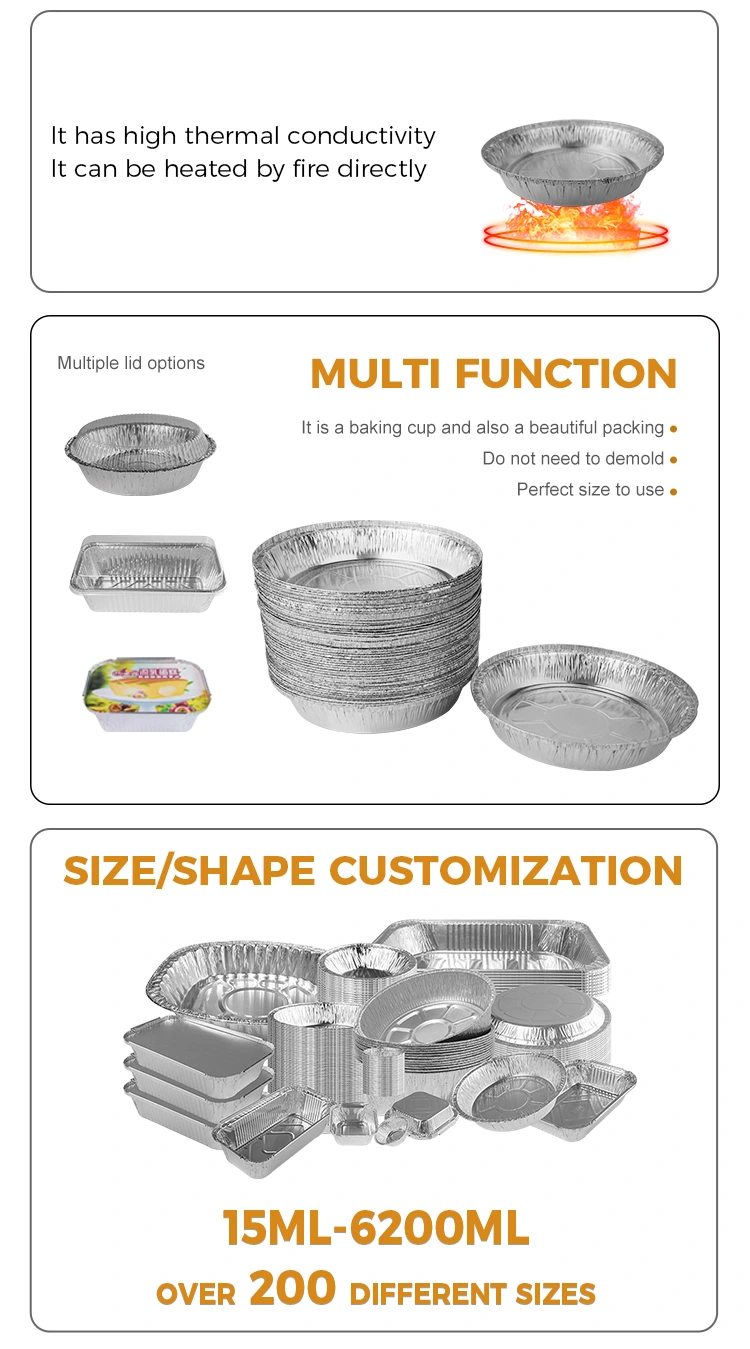 Yunchu Aluminium Foil Dobavitelj Proizvodnja veleprodajna okrogla zrak pečica pečica Silver Aluminium Foil Contaters Design izjemno, lahka in praktična, teža je približno 10,23 grama, enostavna za zlaganje in shranjevanje v omari, gladki površini, na voljo je, da je narezana tekstura, razne pa zabojnikov, ki so različni zabojniku in stabilni sili, močni zaboj in stabilni utrip, močna trenja in stabilna sila, ki je močna cena in stabilna sila, ki je močna trenja, močna trenja in stabilna sila, ki je močna trenja, močna trenja in stabilna sila, ki je močna trenja in stabilna sila, ki je močna trenja in stabilna sila, ki je močna trenja, močna trenja in stabilna sila, ki je močna trenja, močna trenja in stabilna sila, močna trenja in stabilna cena, ki je močna cena in stabilna sila, ki je zabojniku močni in stabilni sili. Izbrati je mogoče različne velikosti, visoka temperatura pečenja nima posebnega vonja, zelo primeren je za velike supermarkete za označevanje in skeniranje dela po predelavi hrane, njegova zmogljivost je prostorna, dovolj za zadrževanje vseh vrst dnevne hrane in prigrizkov, da zadovolji potrebe raznolike uporabe. Kot izdelek za enkratno uporabo ga ni treba očistiti, kar znatno zmanjšuje stroške dela. In addition, the product is equipped with aluminum foil PET lid and aluminum foil paper lid, which has excellent oil leakage and waterproof performance, and can remain stable and not deformed at high temperatures, thereby improving the freshness and heat preservation effect of food, aluminum foil lid can be customized with printing patterns, which can improve the recognition of the product and the company, the product strictly follows ISO9001 and SGS standardi za stik s hrano za zagotovitev varnosti in kakovosti hrane.