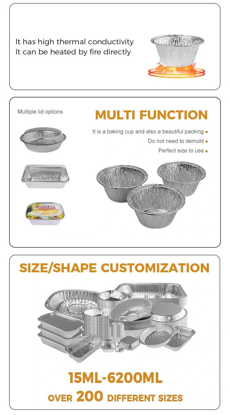 Značilnosti: Okrogla pekača torta Silver Aluminium Foil Food je zdrava in okolju prijazna, ni treba očistiti, primerna je za izdelavo različnih domačih prigrizkov, poleg tega pa je tudi obvezen izdelek za pekarne, material iz aluminijaste folije je varen in higienski, brez čiščenja, ki ga lahko pečete nad odprtim plamenom, ki je priročno za izdelavo hrane.