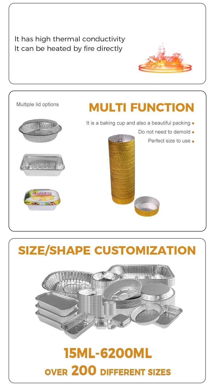 Ta okrogla majhna majhna majhna pecilna srebrna aluminijasta folija je prilagojena tovarna Yunchu in je narejena iz srebrnega materiala iz aluminijaste folije, modela J35-16. Idealen je za postrežbo majhnih porcij hrane, kot so prigrizki in želeji, da zadovolji potrebe sodobnih potrošnikov za majhne in raznolike porcije hrane. Priročno je uživati ​​sam ali deliti z drugimi.