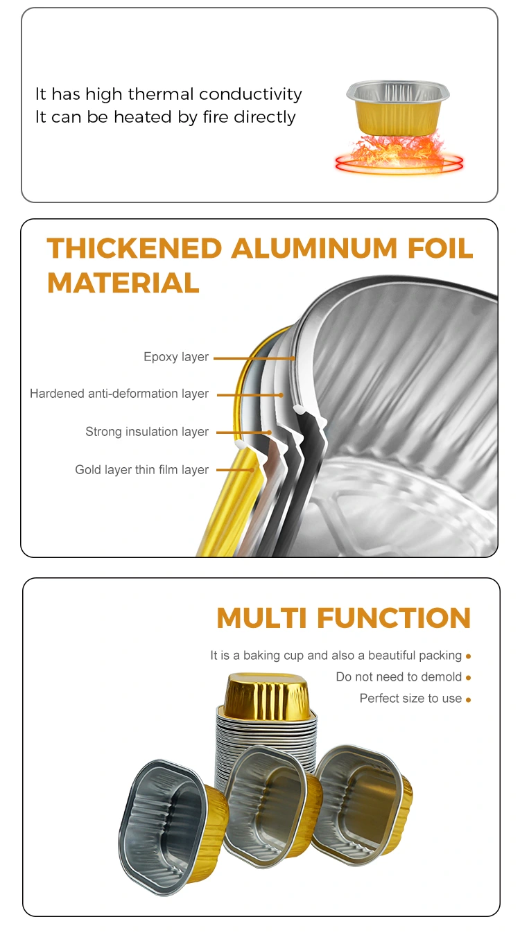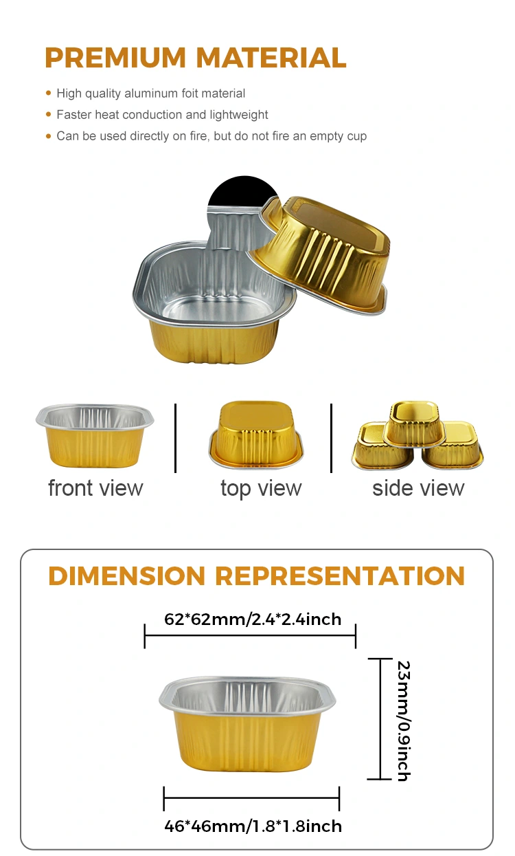 Proizvajalčeve kvadratne skodelice za peko sladic iz aluminijaste folije Yunchu. Posode iz aluminijaste folije z gladko steno se lahko uporabljajo v zračnih cvrtnikih, peki, omakah itd. Te skodelice za peko imajo posebno ojačano zasnovo reber, njihova struktura kratkega telesa skodelice pa omogoča, da imajo dobre torne lastnosti, ne zdrsnejo preprosto, jih je enostavno vzeti in ne poškodujejo rok in ust. Primerne so za pripravo različnih sladic, vključno s kolački, kremami, krhkim pecivo, pitami, cimetovimi žemljicami, sirovimi kolači, kremami in pudingi. Ta rebrasta struktura zagotavlja dodatno podporo in je posebej primerna za uporabo v komercialnih pekarnah ali velikih supermarketih.